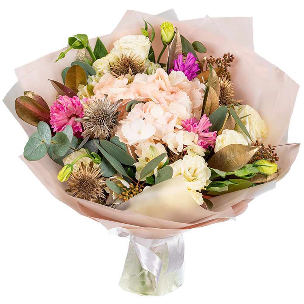 Гортензия, эустома, эвкалипт, гиацинт, эрингиум, зелень.